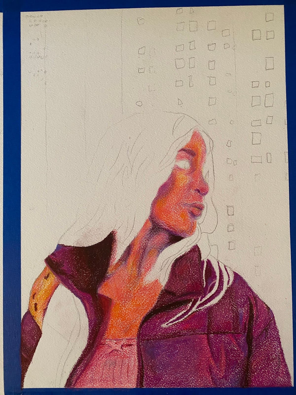 I am in the middle of drawing my piece with colored pencils - I need to finish the hair and a bit of the jacket and the eye. I am planning on painting the background but I am not 100% sure yet. The background is going to be a black/dark city scene.