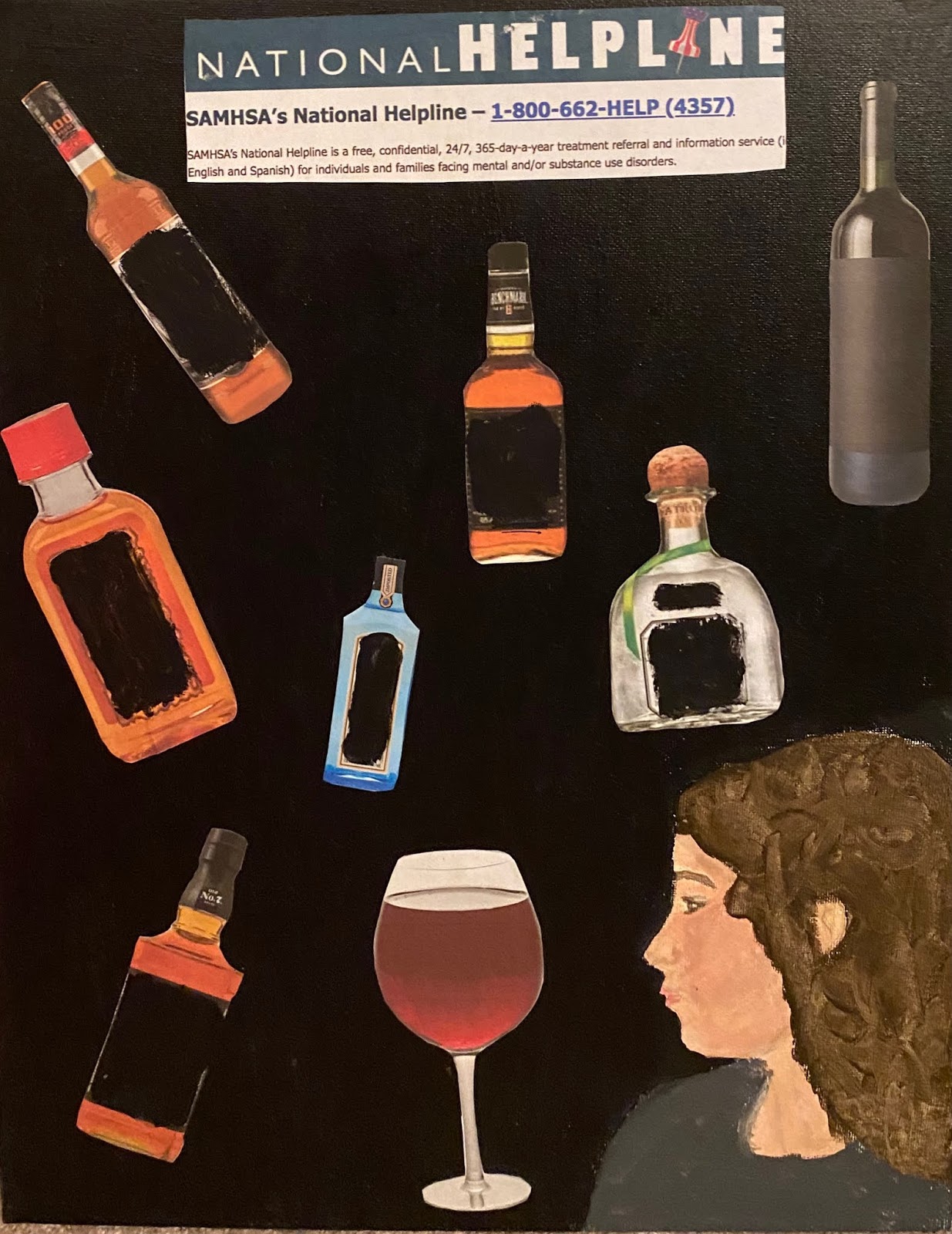 "Bigger than me": this is a piece of a woman who knows she needs help. Her obstacles are the bottles and she needs to find her way to the helpline. The bottles are as big as her because she feels it is the most important thing in her life.