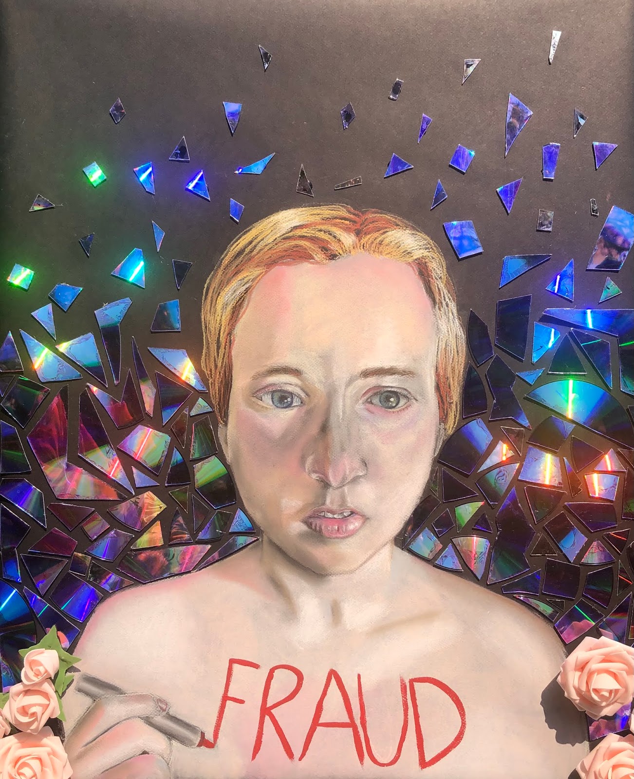 To create this piece, I wrapped black paper around a 24''x 36" canvas using duct tape like a present and traced a photo of myself in pencil (because I like to work with negative space). However, after I finished tracing, I couldn't really see my pencil lines, so some of my work (such as the nose and eyes) are freehand. I completed the figure, hand, and pen in chalk pastel and then painted FRAUD on top of the subject's chest in red Guache paint (I experimented writing with different mediums over chalk, and the only mediums that worked were guache and acrylic). Next, I cut up 15 CDs into geometric shapes of different sizes and pieced them together like a puzzle in the back. I created a gradient of highly concentrated pieces at the bottom, and less concentrated at the top, so it would look as if the glass was falling on the subject. Then I hot glued them to the canvas. Next, I added three flowers to the bottom of each corner that I made with pink and green felt and hot glue.